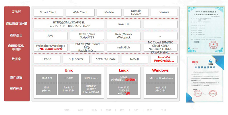 全面支持國產基礎軟、硬件,NC Cloud具有自主知識產權,擁抱開源技術支持,從硬件服務器體系到客戶端的開放性和跨平臺。能夠充分利用客戶現(xiàn)有資源,保護客戶硬件和軟件等已有資源,并可方便客戶已有異構系統(tǒng)的應用整合。