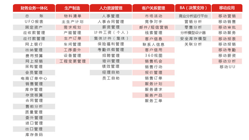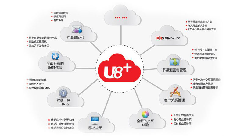 用友U8+作為云時(shí)代的產(chǎn)物,針對(duì)中國(guó)乃至世界市場(chǎng)中型企業(yè)的發(fā)展特性,為中型企業(yè)提供最全面的“軟件+行業(yè)方案+云服務(wù)”,涵蓋了CRM、電子商務(wù)、財(cái)務(wù)、供應(yīng)鏈、生產(chǎn)制造、管理會(huì)計(jì)、人力資源、移動(dòng)、商業(yè)分析與OA等領(lǐng)域的應(yīng)用。